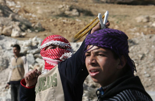 1月5日,在約旦河西岸城市希伯倫附近,巴勒斯坦少年向以色列士兵投擲石塊。當天,一些巴勒斯坦人在這里抗議以軍對加沙的軍事行動,并與以色列士兵發生沖突。