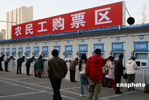 2009年1月5日,北京西站北廣場西側,首批70個農民工購票區(qū)臨時售票窗口對外開放。中新社發(fā) 任丘 攝