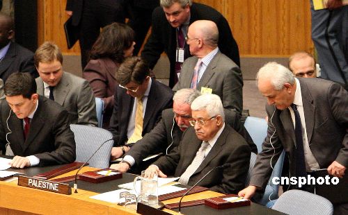 聯合國安理會1月6日晚就加沙局勢舉行緊急會議。巴勒斯坦民族權力機構主席阿巴斯(前右二)出席會議,并要求安理會立即行動促成加沙地區停火。中新社發 李靜 攝