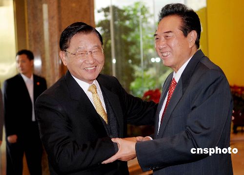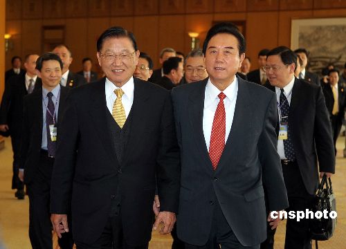 一月七日下午,海峽兩岸關(guān)系協(xié)會(huì)會(huì)長(zhǎng)陳云林在深圳五洲賓館,會(huì)見(jiàn)臺(tái)灣海峽交流基金會(huì)董事長(zhǎng)江丙坤率領(lǐng)的海基會(huì)臺(tái)資企業(yè)考察團(tuán),兩會(huì)就臺(tái)企應(yīng)對(duì)金融危機(jī)交換意見(jiàn)。中新社發(fā) 陳文 攝