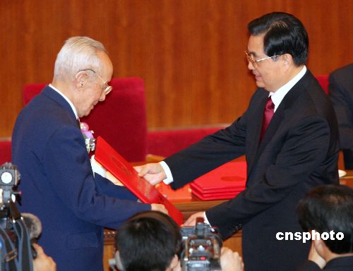 胡錦濤為徐光憲頒發國家最高科學技術獎。中新社發 宋吉河 攝
