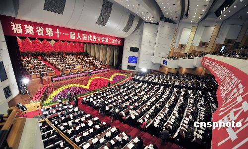 一月十日,福建省第十一屆人民代表大會第二次會議在福州開幕。福建省省長黃小晶在會上作政府工作報告時指出,二00九年福建將積極擴大“三通”效應,提升閩臺經貿合作水平,促進閩臺文化交流雙向互動。中新社發 劉可耕 攝