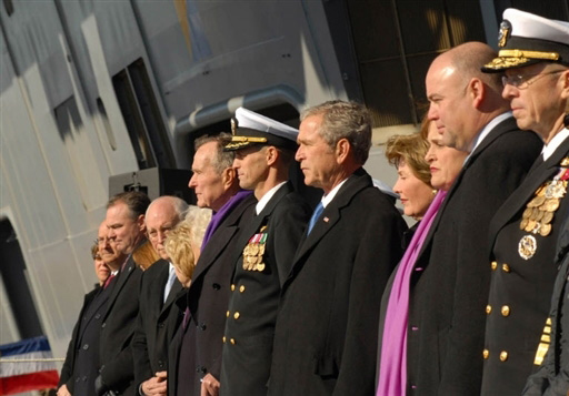 美國總統布什與親近家人及高層官員,參加核子動力航空母艦“布什號”(USS George H.W. Bush)下水服役儀式。