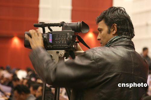 1月12日,西藏自治區政協九屆二次會議在拉薩開幕。本次會議首次特邀印度、尼泊爾記者前來采訪報道。圖為印度記者在現場進行采訪報道。中新社發 賈長飛 攝