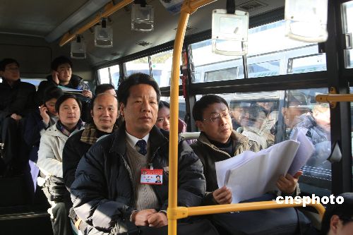 1月12日,政協(xié)上海市第十一屆委員會第二次會議開幕,面對經(jīng)濟(jì)不景氣以及環(huán)保問題,許多上海市政協(xié)委員乘坐指定的公共汽車出席。中新社發(fā) 潘索菲 攝