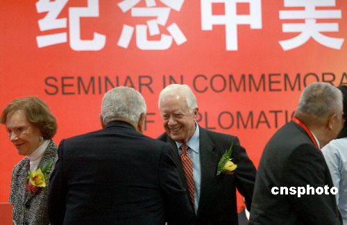 1月12日,紀念中美建交30周年研討會在北京開幕。中國前副總理錢其琛、美國前總統卡特、美國前國務卿基辛格等在開幕式上致辭。研討會會期兩天,以紀念中美建交30周年為主題,就中美關系30年發展的主要經驗及對世界的意義、中美關系未來展望及對發展兩國關系的建議等議題進行研討。 中新社發 鄭雄增 攝