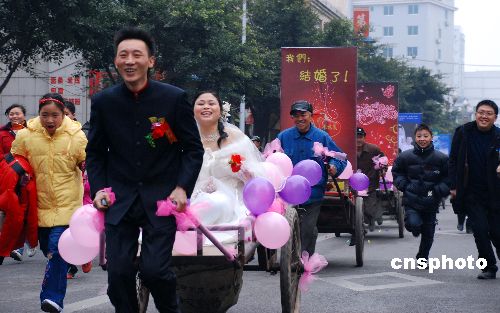 1月13日上午,一支由新郎拉著板車載著新娘的板車迎親隊,浩浩蕩蕩經過重慶梁平縣城,沿途向行人撒喜糖、紅包,然后奔向新家。這支新穎、獨特的迎親板車隊,引得沿途行人駐足觀看,許多汽車主動停下讓道,并鳴笛向他們祝賀。沿途許多市民對他們這場婚禮贊不絕口,送上對新人的祝福。新郎周剛介紹,新娘黃林鳳家住廣西來濱市,她愿從那么遠的地方嫁過來,讓他很感動,就想以一種特別的方式娶她,因此請人策劃了這場婚禮。新郎稱,租汽車需花2000元左右,租10輛板車只花了400元,用板車比汽車節約,其實節約這點錢對他們來說不算什么,但主要的是這種形式終身難忘,要的是倡導婚事新辦節約。當天他們向行人撒了約5公斤喜糖,撒了200個、內裝2元錢紅包。中新社發 木文 攝