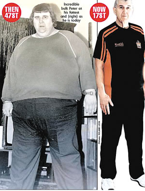 英國超級胖司機為保命減肥380斤:英國59歲的貨車司機彼得卡羅爾體重達到298公斤。肥胖給他的身體帶來了眾多疾病,醫生向他發出警告,稱如果再不減肥就應該開始為自己準備葬禮。為了拯救性命,彼得接受了胃旁路減肥手術,接著他到健身館進行鍛煉,最后竟成功減掉了190公斤體重。