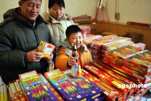 一月十九日,是北京2009年春節煙花爆竹銷售的首日,北京舉行聲勢浩大的燃放煙花爆竹注意安全的宣傳咨詢活動。在主會場,警方除聘請演員潘長江、郭冬臨作為宣傳大使外,還向市民發放宣傳品,增強市民的安全意識。圖為市民在熊貓煙花的定點銷售處踴躍購買煙花。中新社發 任海霞 攝