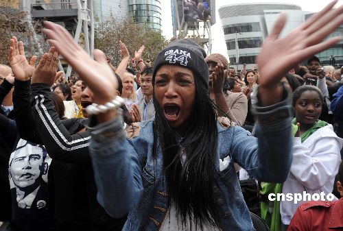 圖為非裔婦女夏莉·威爾遜看到奧巴馬就職興奮異常。中新社發(fā) 張煒 攝