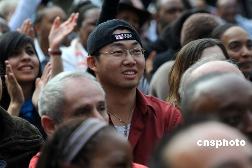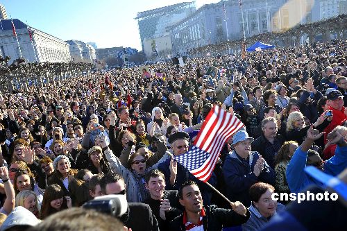 舊金山人們在市政府廣場同步觀看美國第四十四任總統奧巴馬就職典禮。中新社發 陳鋼 攝