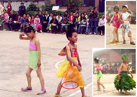 幾名小學生穿著有創意的服裝,利用廢舊報紙、綠葉等做成服裝道具,在一簡陋的校園操場上學著模特的貓步行走,淳樸天真的表演贏得了許多網友跟帖喝彩,稱“除了能宣傳環保,還能鍛煉、啟發孩子”,不過也有人并不認可。