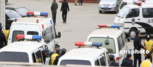 圖為當日中午,接押張玉軍、張彥章等人的警車駛回法院后院,法警押送嫌疑人進入法院。中新社發 翟羽佳 攝