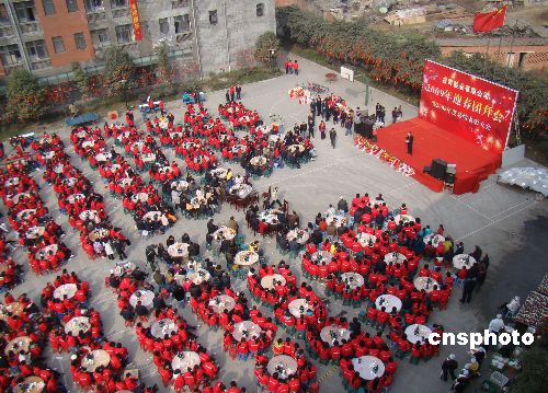 1月22日,四川災區一家名為古奇鞋業的企業在廣場上辦起了規模宏大的“壩壩宴”。該企業董事長現場承諾:“不管企業如何困難,都會及時發放員工工資,不會因任何原因裁員!”將團年飯的氣氛推向高潮。圖為該企業團年飯現場。中新社發 王萌 攝