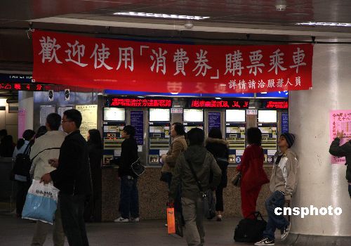 圖為臺北車站掛出的使用消費券可購火車票的條幅。中新社發 陳立宇 攝