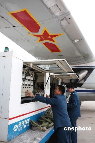 官兵為增雨飛機補充電源。
