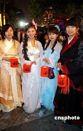 二月九日晚,在僑鄉泉州城擁擠的賞燈人群里,幾位特地身著漢服出游的年輕姑娘分外引人注目。中新社發 傅丹丹 攝