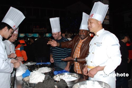 二月九日,是中國傳統佳節元宵節,萬盞花燈把廣西陽朔縣城妝點得流光溢彩,格外迷人。二萬多名中外游客和四鄰八鄉的民眾紛紛到陽朔吃湯圓、看龍獅、賞花燈、猜燈謎,觀焰火,元宵的氛圍喜慶而熱烈,旅游名縣陽朔成了歡樂的海洋。圖為中外游客共同參與現場制作湯圓。