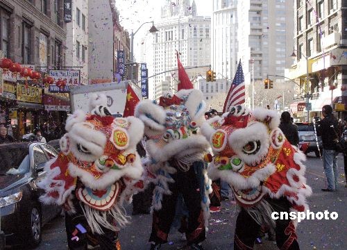 2月9日,美國紐約唐人街的醒獅隊伍游街鬧元宵,熱鬧非凡。中新社發(fā) 魏晞 攝