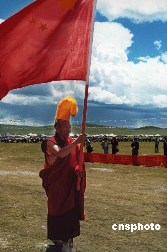 藏族同胞高舉五星紅旗。中新社發 扎西朗杰 攝