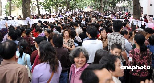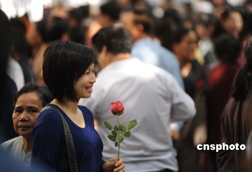 二月十四日,情人節(jié),廣西南寧市組織大型相親交友活動。這場名為“媽媽相親團”的交友活動,由于交友過程可由父母代勞,得到當(dāng)?shù)厍嗄甑臒崃掖蹬酰?dāng)天有超過一萬名青年報名參與相親,場面十分火爆,眾多父母到場為兒女相親。中新社發(fā) 蔣雪林 攝