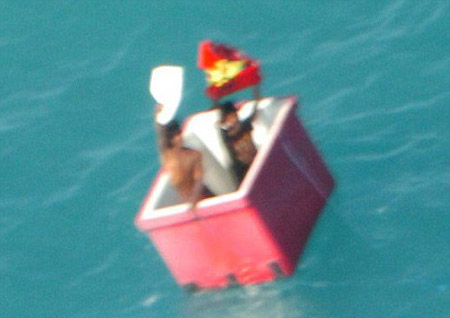 08年12月23日,兩個(gè)緬甸漁民的漁船在澳洲北部海岸外翻覆,船上20人落海。他們兩人擠進(jìn)面積只有一張小桌子大的冰桶里,在鯊魚(yú)出沒(méi)的海上漂流了25天,才被澳洲海岸巡防隊(duì)的飛機(jī)發(fā)現(xiàn)。