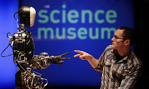 2月17日,在英國(guó)倫敦的科學(xué)博物館,一名工作人員與一個(gè)名為BERTI的機(jī)器人在玩“剪刀、石頭、布”的游戲。設(shè)計(jì)這個(gè)機(jī)器人的初衷是幫助科學(xué)家研究未來人與機(jī)器人如何互相影響。