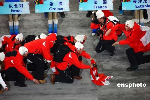圖為在開幕式上瑞典代表團以獨特的方式入場。中新社發 富田 攝