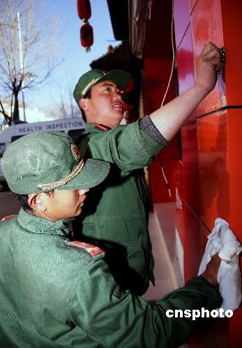 2月25日是西藏傳統藏歷新年。藏歷新年來臨之際,西藏總隊官兵紛紛走上街頭,打掃衛生、清理城市牛皮癬、為城市美容。中新社發 常鈞 攝