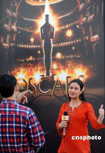 當地時間二月二十日,印度星空衛視的記者正在好萊塢柯達劇場前進行現場報道。全球影迷矚目的第八十一屆奧斯卡電影金像獎頒獎典禮將于二十二日晚在這里舉行,通往劇場的巨大紅地毯已經鋪就,各項準備工作基本就緒。由印度演員出演的印度題材電影《貧民富翁》被認為是今年最佳影片獎的最大熱門。中新社發 張煒 攝
