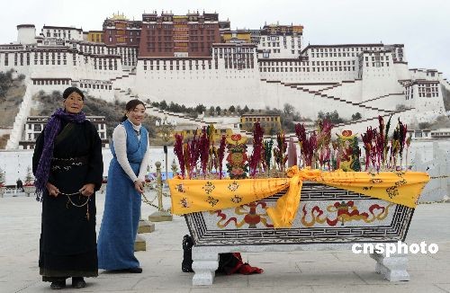2月23日,拉薩布達拉宮廣場布置巨型“切瑪”迎接藏歷新年。現場這位藏族老阿媽稱這是她見過的最大的“切瑪”。藏歷新年時,藏族民眾家家戶戶供“切瑪”,人人都嘗“切瑪”。當客人走進藏民家時,主人首先會獻“切瑪”,客人從堆放在“缽”中的“切瑪”里拿出一點兒來,并說“扎西德勒”(吉祥如意之意),爾后放進嘴里,預祝新春如意、身體康健。