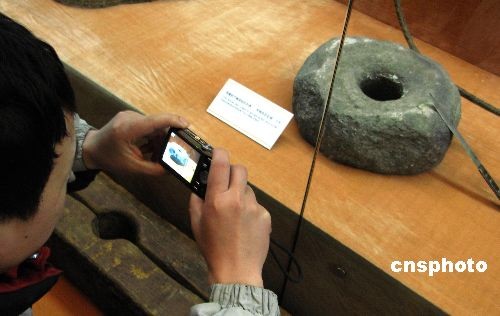 2月25日,在北京民族文化宮舉辦的《西藏民主改革50年大型展覽》免費向民眾開放。圖為展覽上展出的舊西藏朗子轄監獄的刑具挖眼用的石帽和刀子。中新社發 鄒憲 攝