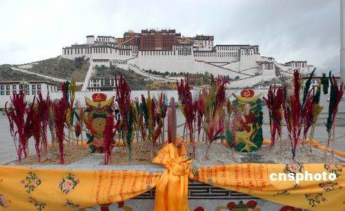 藏歷新年期間,風景秀麗的布達拉宮廣場上供奉了幾只大型的“切瑪”,象征著五谷豐登、風調雨順和吉祥如意的美好愿景。供奉“切瑪”是藏族民眾的新年傳統習俗,切瑪盒內一頭裝有拌好的酥油糌粑,另一頭裝滿小麥,壘成金字塔型,中間插上一朵花或酥油制的“字珠”。中新社發 周波 攝