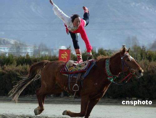 2月27日,拉薩賽馬場上演一年一度的傳統賽馬表演,西藏馬術隊的女騎手精湛的技藝博得了場內觀眾的陣陣喝彩。中新社發 劉震 攝