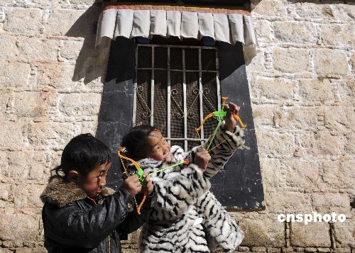 2月28日,拉薩東城策門林藏民聚居區(qū),兩名藏族小孩在玩耍玩具弓箭。中新社發(fā) 廖攀 攝