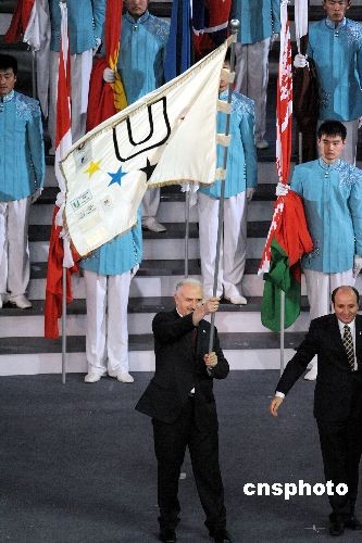 國際大體聯(lián)會旗被轉(zhuǎn)交到下屆大冬會主辦城市——土耳其埃爾祖魯姆市代表手中。中新社發(fā) 姚庭山 攝
