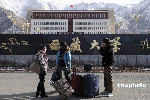 3月1日,西藏拉薩,西藏大學在拉薩東郊的新校園前,學生們陸續返回學校。西藏大學定于3月3日正式開學。中新社發 廖攀 攝
