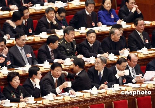 3月3日,全國政協十一屆二次會議在北京人民大會堂開幕,委員們在會議開幕前交流。中新社發 盛佳鵬 攝