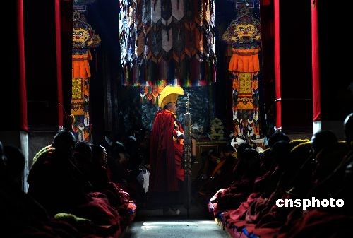 3月4日,中國藏歷新年正月初八,西藏拉薩哲蚌寺,“鐵棒喇嘛”在措欽大殿舉行的傳昭大法會(huì)上。“鐵棒喇嘛”藏名:“格貴”,負(fù)責(zé)維持僧團(tuán)清規(guī)戒律的寺院執(zhí)事,歷史上藏傳佛教各大寺院的糾察僧官巡視僧紀(jì)時(shí),常隨身攜帶鐵杖,故有“鐵棒喇嘛”之俗稱。中新社發(fā) 廖攀 攝