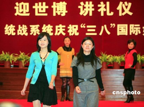 3月4日,上海統(tǒng)戰(zhàn)系統(tǒng)女公務(wù)員歡聚一堂,穿戴自己最靚麗的時裝,登臺展示禮儀和風(fēng)采。據(jù)悉,這是該機(jī)關(guān)舉行“迎世博、講禮儀、展風(fēng)采、慶祝三八婦女節(jié)”活動之一。中新社發(fā) 潘索菲 攝