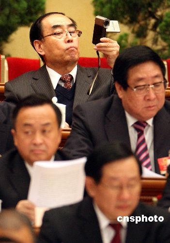3月5日上午,十一屆全國人大二次會議在北京人民大會堂開幕,一名在主席臺最高層就座的主席團成員 “居高臨下”拍攝會議盛況。中新社發 任晨鳴 攝