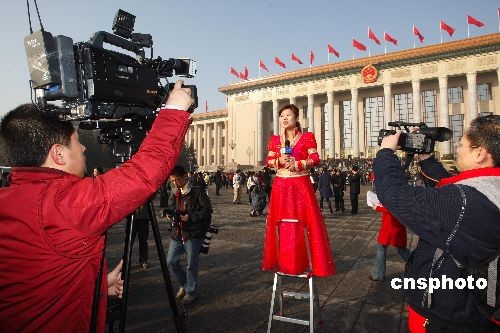 3月5日,十一屆全國人大二次會議在北京人民大會堂隆重舉行。大會吸引了近4000名中外記者前來采訪報道。圖為內蒙古電視臺的記者在大會堂外做現場報道。中新社發 李松 攝