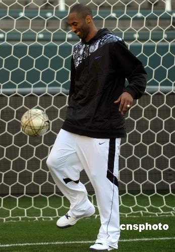 圖為少年時(shí)代曾練過足球的科比在綠茵場(chǎng)上秀球技。中新社發(fā) 張煒 攝