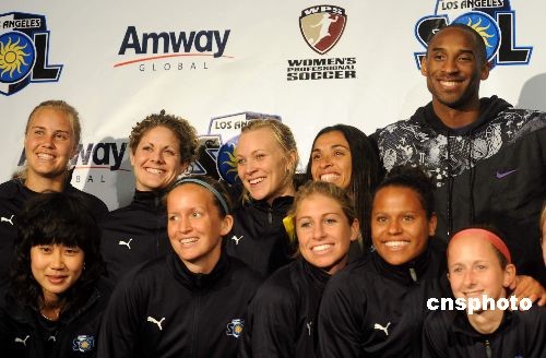 NBA著名球星科比·布萊恩特在洛杉磯歡迎加盟洛杉磯太陽隊(美國女子足球職業聯盟球隊)的巴西球星瑪塔(后排右二)、中國球員韓端(前左一)等外籍球員,并與太陽隊隊員合影。中新社發 張煒 攝