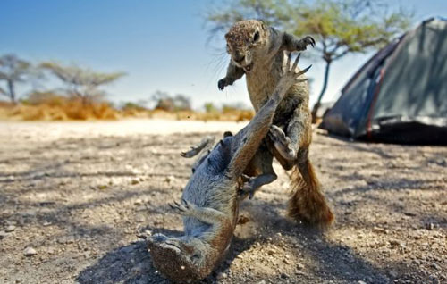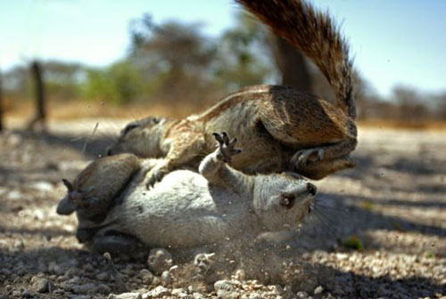 松鼠“耍功夫”。一名叫大衛·斯萊特的英國攝影師在納米比亞的埃托沙國家公園拍到了幾只南非地松鼠搏斗的場景。照片拍攝于納米比亞的埃托沙國家公園,一只南非地松鼠正在“教訓”一位“入侵者”。對手倒在地上,這只地松鼠毫不猶豫地用它毛茸茸的腿一陣狂踢,以保護自己領地不受侵犯。