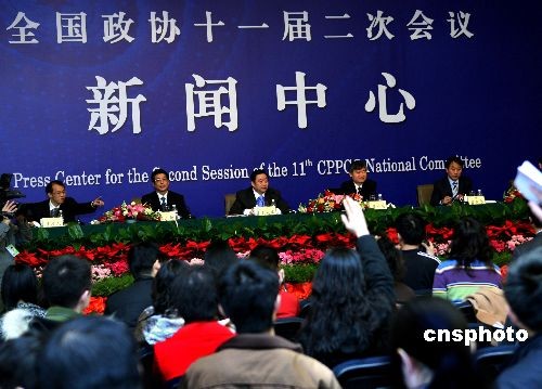 3月7日上午,全國政協十一屆二次會議就“大學生就業問題”舉行記者會,全國政協委員王超斌、張亞忠、蔡繼明、宗立成、金正新回答記者提問。他們普遍認為,在國家出臺具體的政策扶持大學就業的同時,大學生自身改變就業觀念也很重要,從正面看“大學生賣豬肉”現象具有積極意義。中新社發 宋吉河 攝