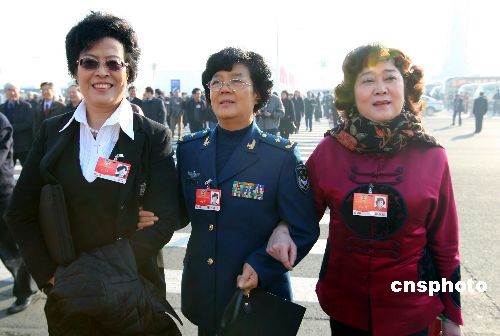 3月8日,眾多女委員在國際婦女節當日出席全國政協十一屆二次會議舉行第三次全體會議。圖為于小文、岳喜翠、何永智在會后輕松步出人民大會堂。中新社發 楊可佳 攝