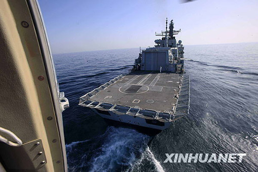 3月9日,在巴基斯坦南部卡拉奇港附近的阿拉伯海舉行的“和平-09”海上多國聯合軍事演習實兵演練中,澳大利亞海軍觀察員(右)在中國海軍“廣州”號驅逐艦上觀摩演習。查春明 攝