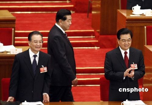 3月10日,十一屆全國人大二次會議舉行第三次全體會議,最高人民法院院長王勝俊、最高人民檢察院檢察長曹建明分別作工作報(bào)告。圖為國家主席胡錦濤、國務(wù)院總理溫家寶、全國政協(xié)主席賈慶林出席全體會議。中新社發(fā) 盛佳鵬 攝