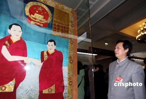 全國政協文藝界委員、扮演“毛澤東”的演員汪國新,3月11日參觀在北京民族宮舉辦的西藏民主改革50年大型展覽。中新社發 傅丹丹 攝